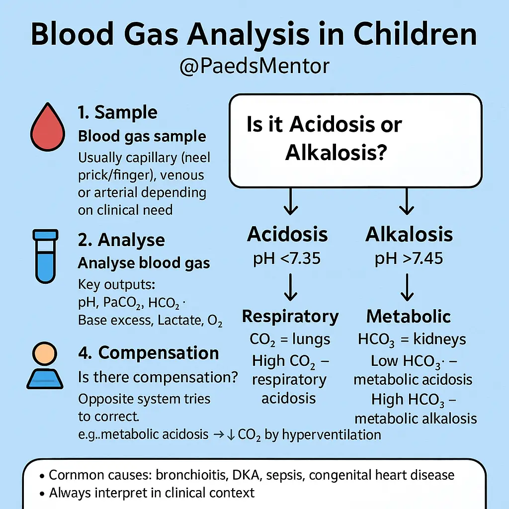 A blood gas is a rapid and powerful diagnostic tool used to evaluate a child’s respiratory, circulatory, and metabolic status. It provides a real-time snapshot of the body’s acid-base balance, ventilation, and oxygenation. Understanding blood gases is critical for managing critically ill children.
