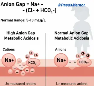 However, it is important to know that the normal anion gap is largely determined by the concentration of albumin, which is a major unmeasured anion. A low albumin level (hypoalbuminemia), which is common in critically ill children, can falsely lower the anion gap, potentially masking a high anion gap metabolic acidosis.