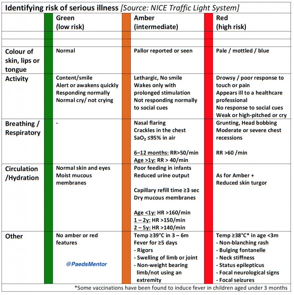 Admission: Consider admission if the child has any red or amber features on the NICE traffic light system. Also, admit if there is high parental or staff concern or if the child has no clear focus for their fever.