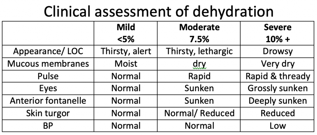 Formula to calculate fluid deficit: Deficit (mls) = 10 x % dehydration x body weight (kg)