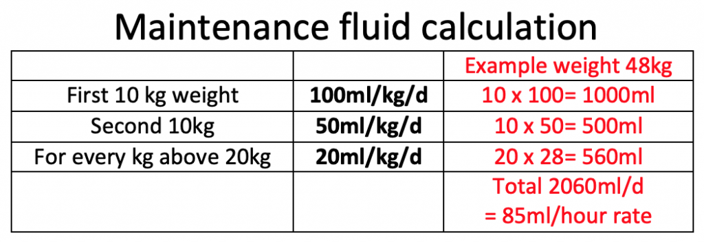First 10kg of weight: Give 100mls/kg/24 hours