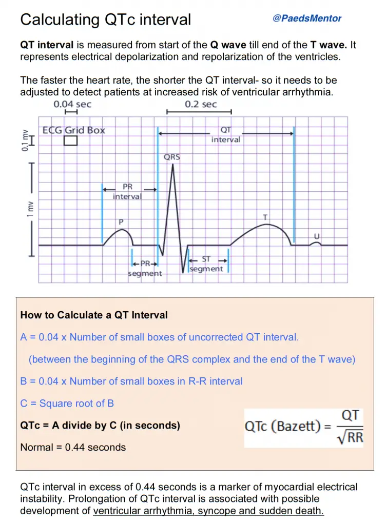 The QTc interval on an electrocardiogram (ECG) represents the time it takes for the ventricles to depolarize and repolarize. A prolonged QTc interval is a significant risk factor for life-threatening arrhythmias, such as Torsades de Pointes. Correctly measuring and interpreting the QTc is a critical skill for paediatric trainees, as normal values in children vary by age and heart rate.