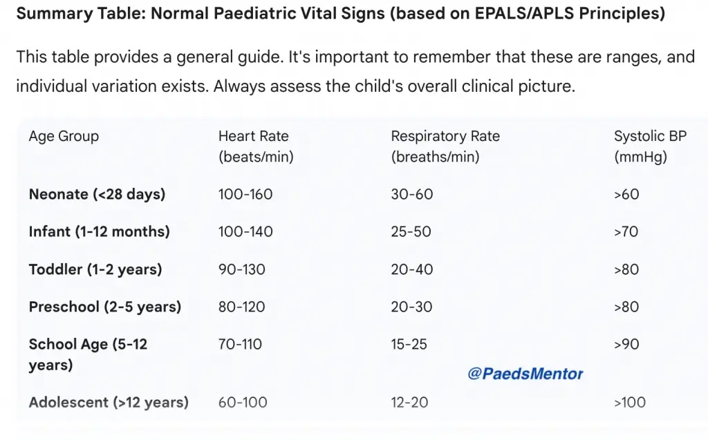 • Explain the concept of PEWS systems, which standardise the assessment of vital signs and trigger a clear, escalating response to a deteriorating child. They are based on the age-related vital sign ranges.