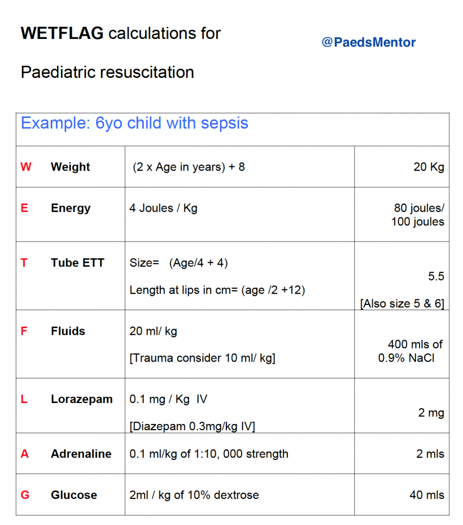 Here is a breakdown of what each letter in the WETFLAG mnemonic represents, along with the standard formulas and calculations. It’s important to note that these are estimates and may vary slightly depending on the specific guidelines (e.g., APLS, Resuscitation Council UK) and local protocols.